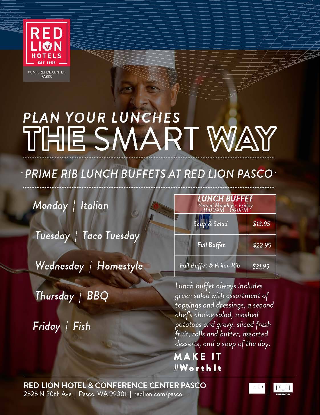 We are located in the largest hotel conference center in the region, the Red Lion Hotel & Conference Center Pasco, near the Pasco Tri-Cities airport. Seasons Restaurant & Buffet is open for breakfast 7 days a week, and open for Lunch Monday-Friday.